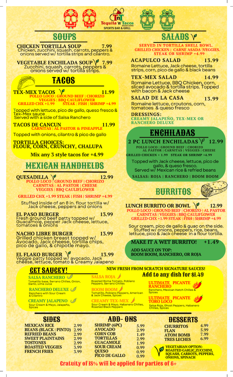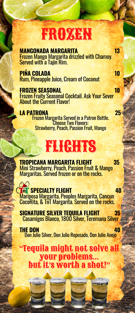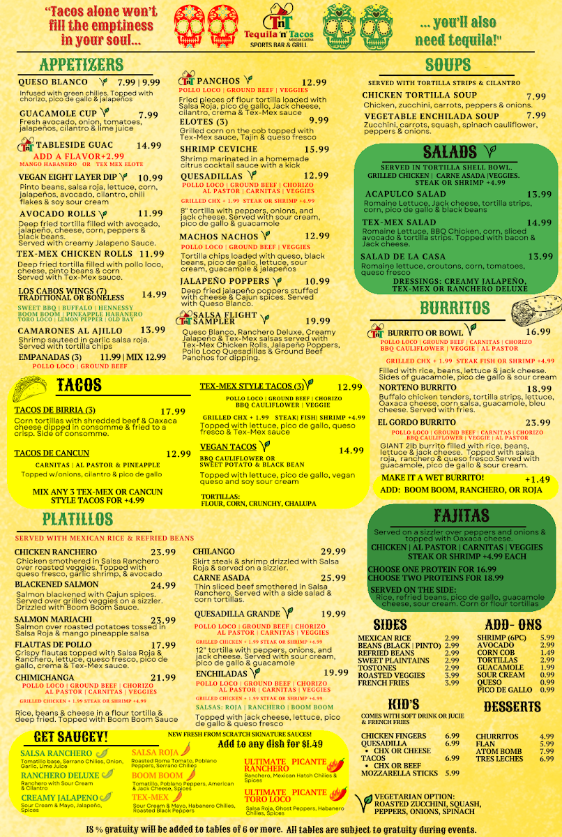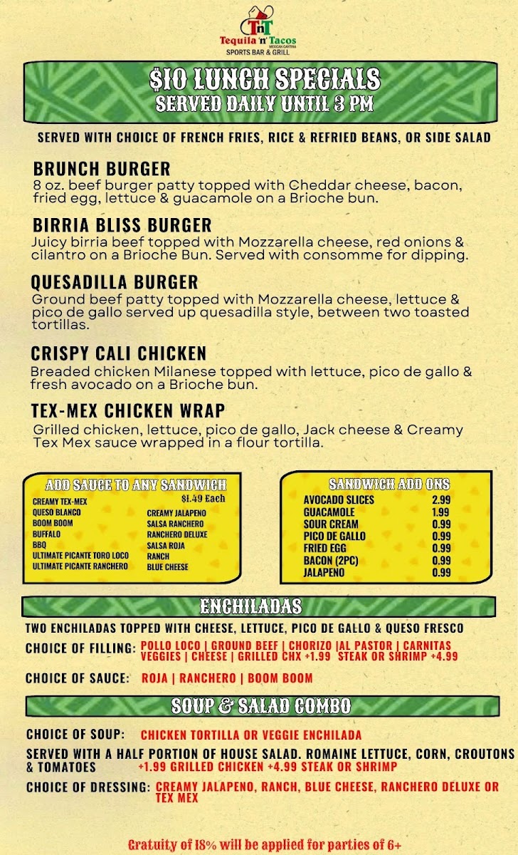 If you're craving a vibrant, flavor-packed dining experience, look no further than Tequila N Tacos Mexican Sports Bar & Grill Menu. Located at 560 Stelton Rd in Piscataway, NJ, this spot is the perfect blend of authentic Mexican cuisine and lively sports bar atmosphere. Whether you're stopping by to watch the game or simply looking to indulge in tasty dishes, the menu has something for everyone. From mouthwatering tacos and sizzling fajitas to refreshing cocktails, every bite feels like a celebration. Plus, the variety of appetizers, salads, and grilled options ensure you'll find the perfect pairing for your drink of choice. With bold flavors, casual vibes, and a menu designed to please, this place makes every meal feel special.